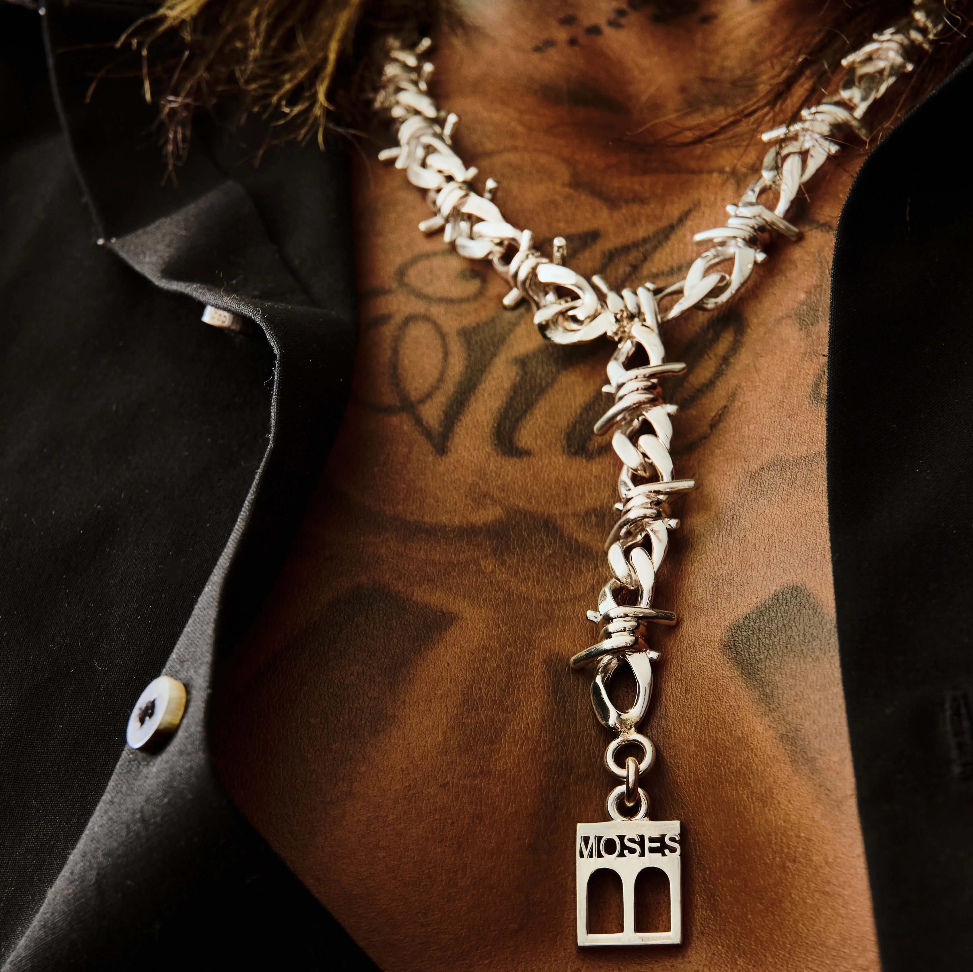 A striking lariat-style necklace crafted entirely from bold barbed wire-inspired links, dropping into a dangling extension finished with a signature Moses brand tag. Raw, rebellious, and one of a kind.