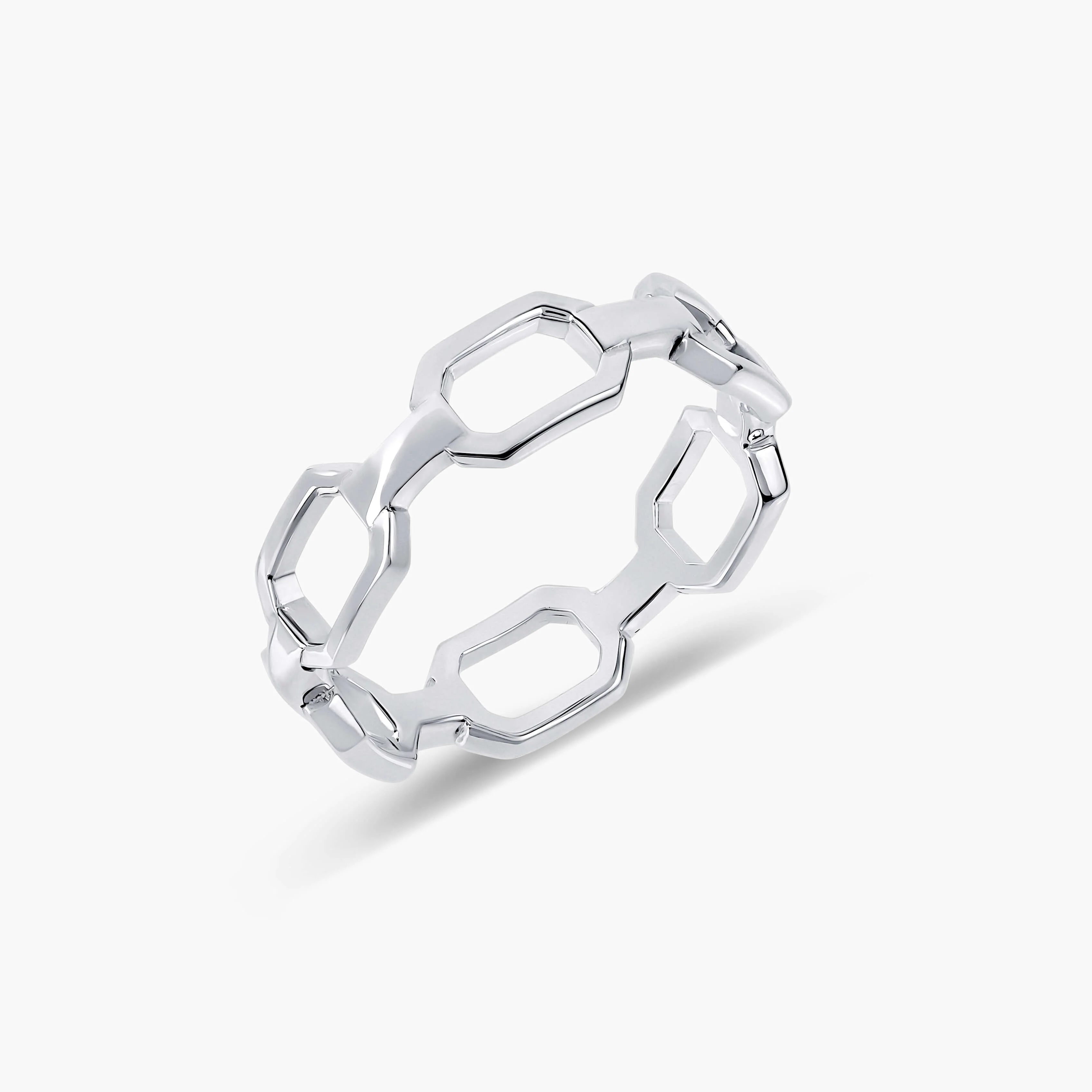 A bold, open-link ring featuring interlocking geometric hexagonal links in a high-polish finish.