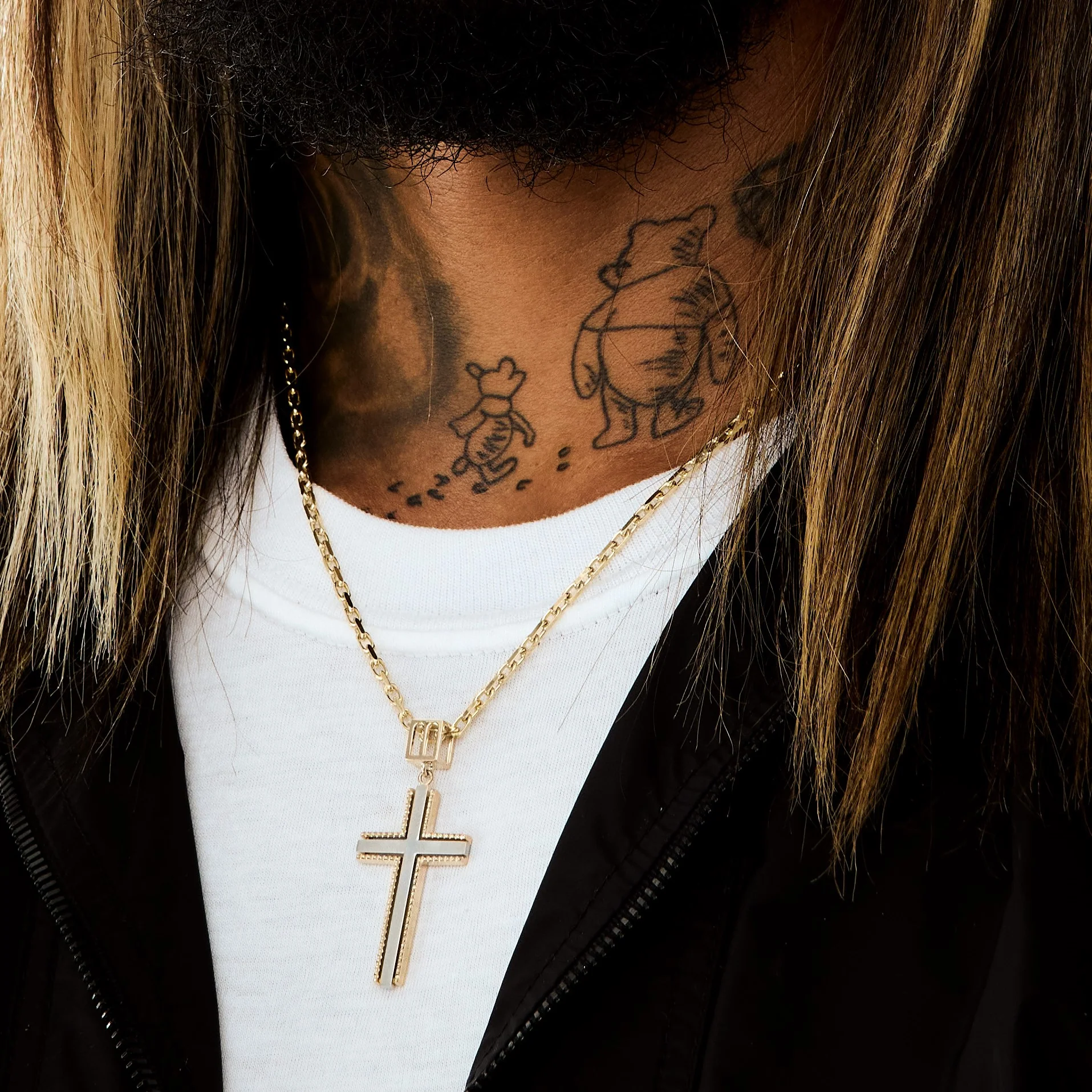 A bold two-tone cross pendant featuring a white gold center framed by yellow gold pyramid-cut edges.