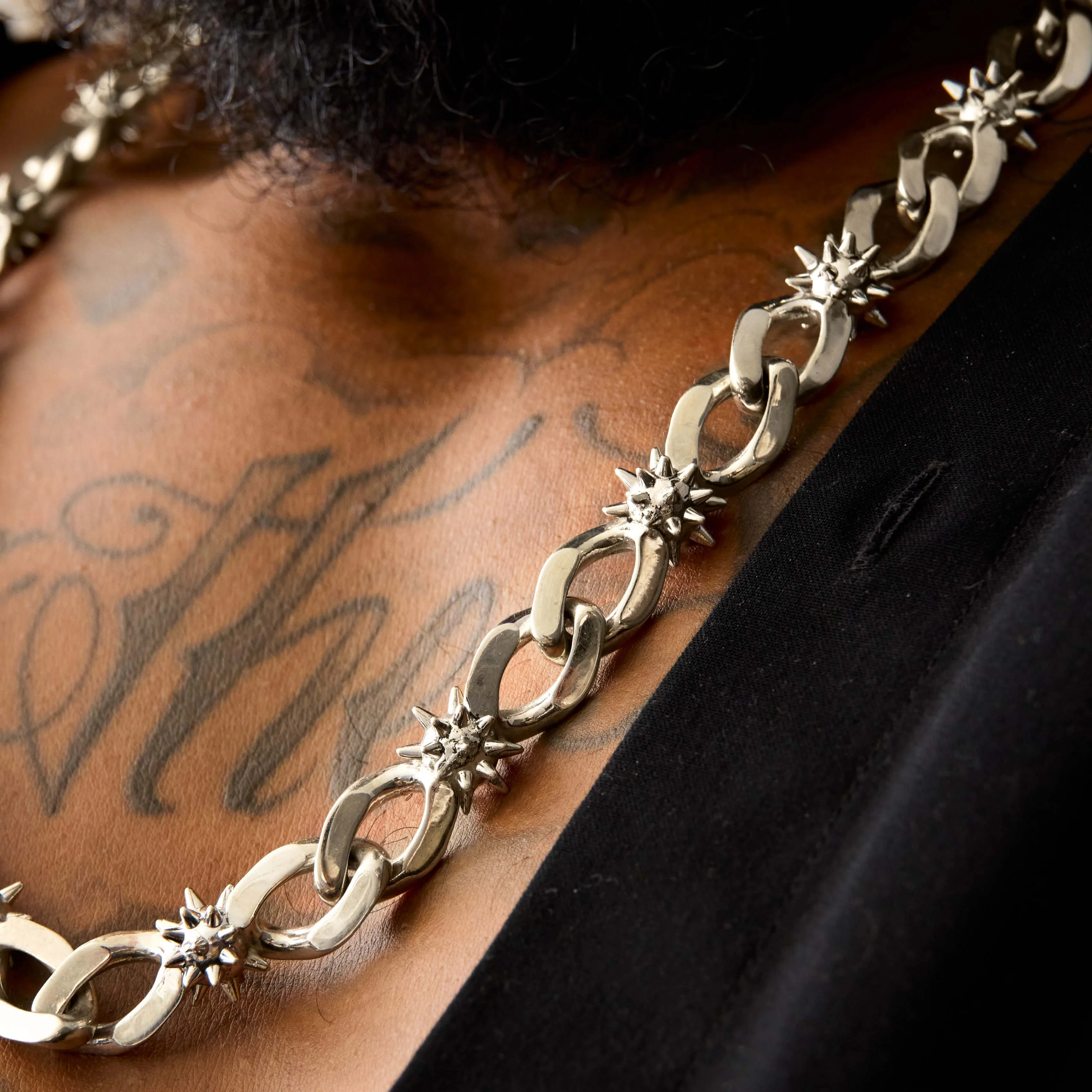A bold chain featuring smooth oval links connected by spiked star-burst accents throughout.