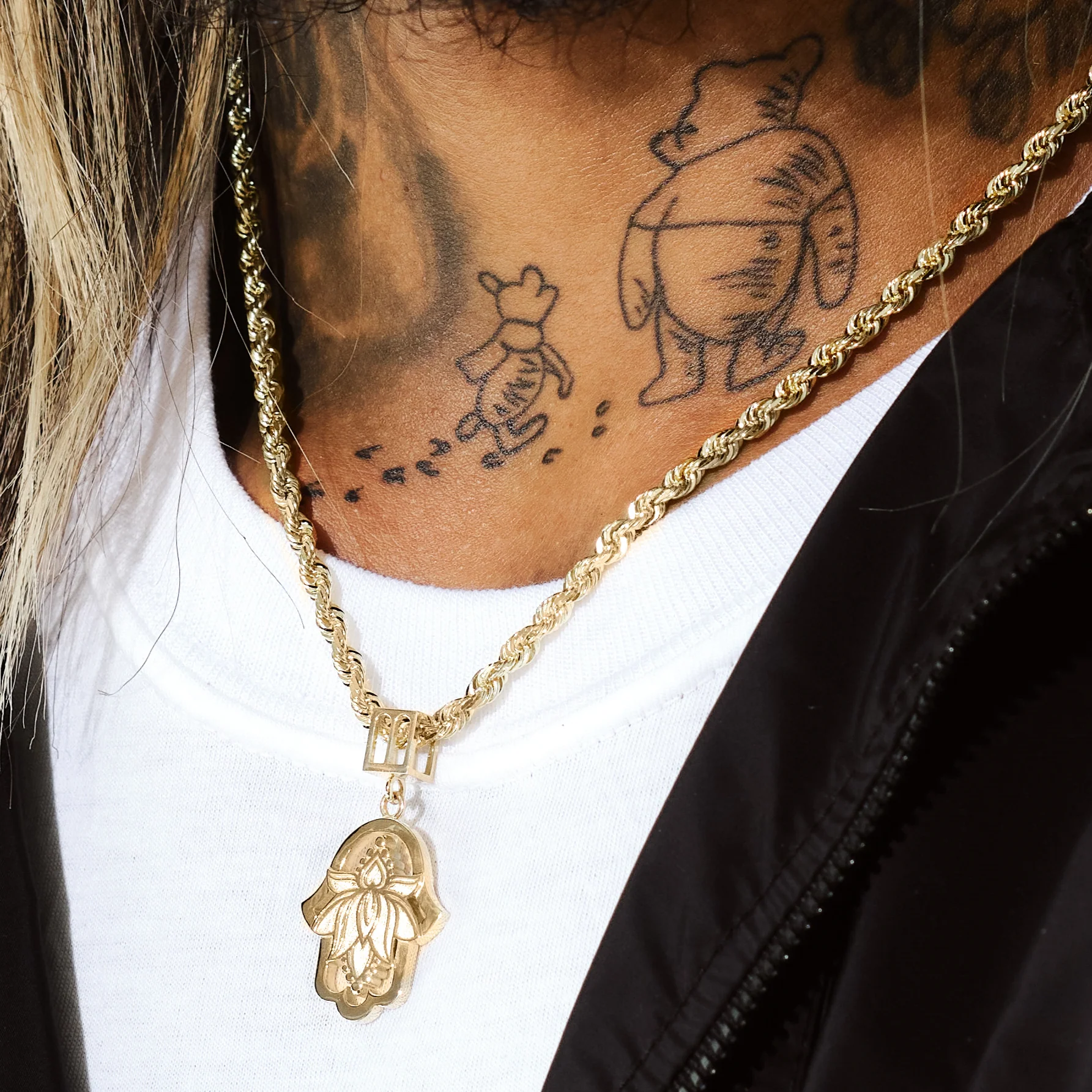 An open-frame Hamsa pendant featuring a beautifully detailed lotus flower at its center with delicate beaded accents. A symbol of protection and renewal, elegantly combined.