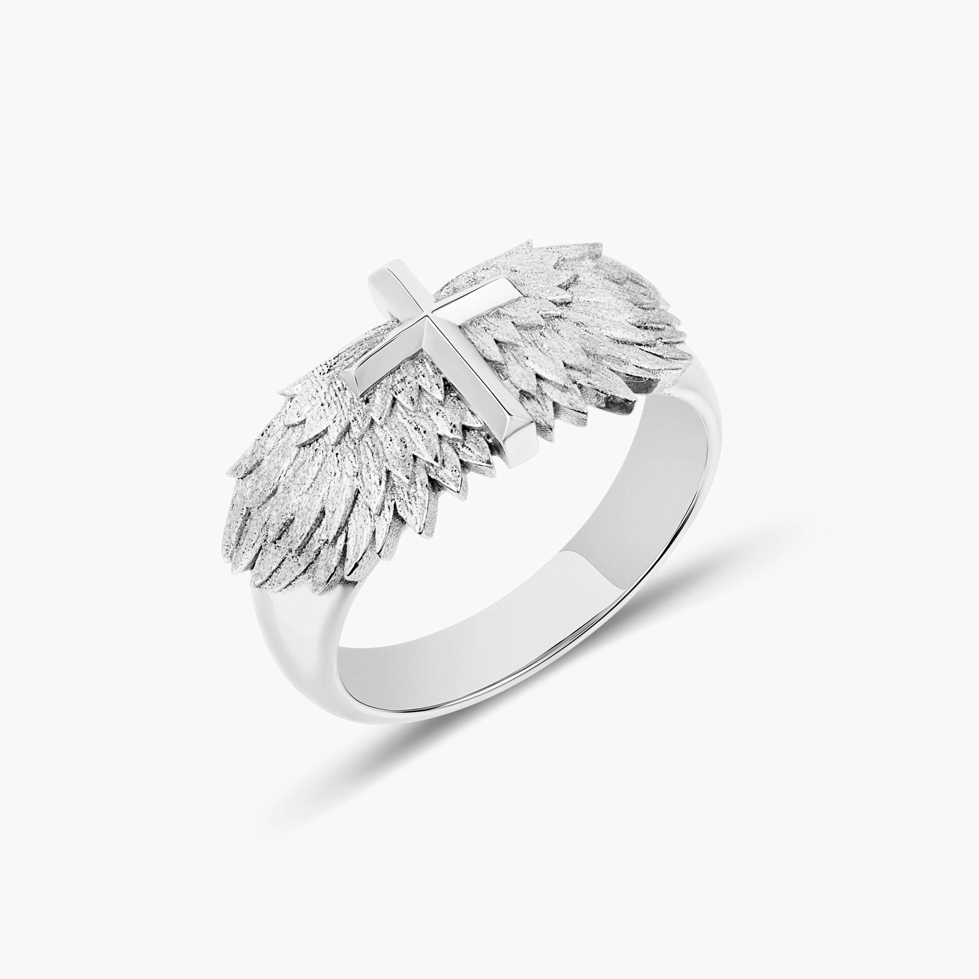 A deeply symbolic ring featuring a raised cross centered between two intricately detailed angel wings, all in a textured gold finish.