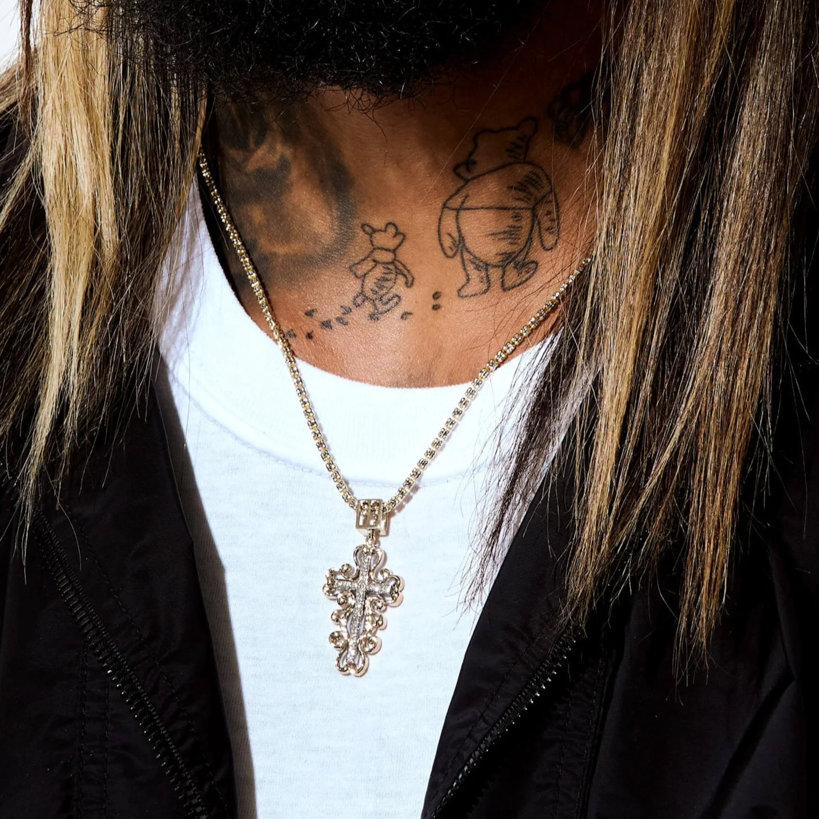 A stunning two-tone cross pendant featuring a diamond-encrusted white gold cross surrounded by ornate yellow gold scrollwork.